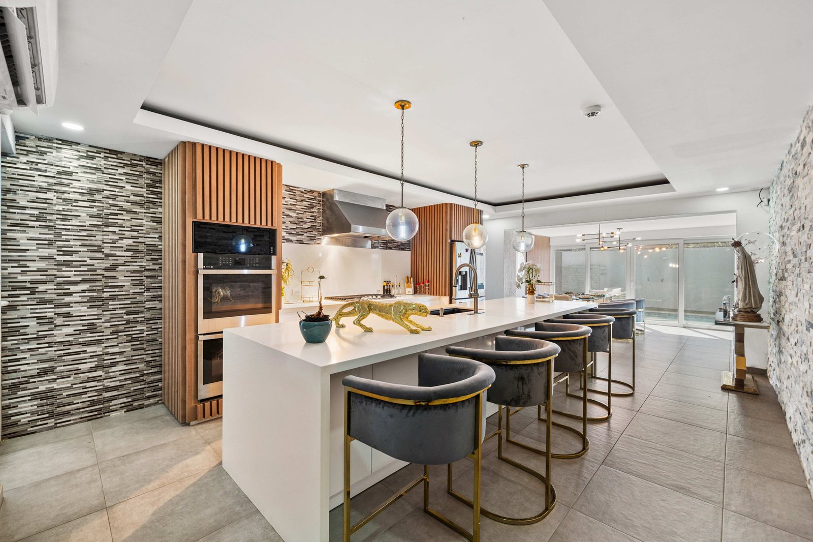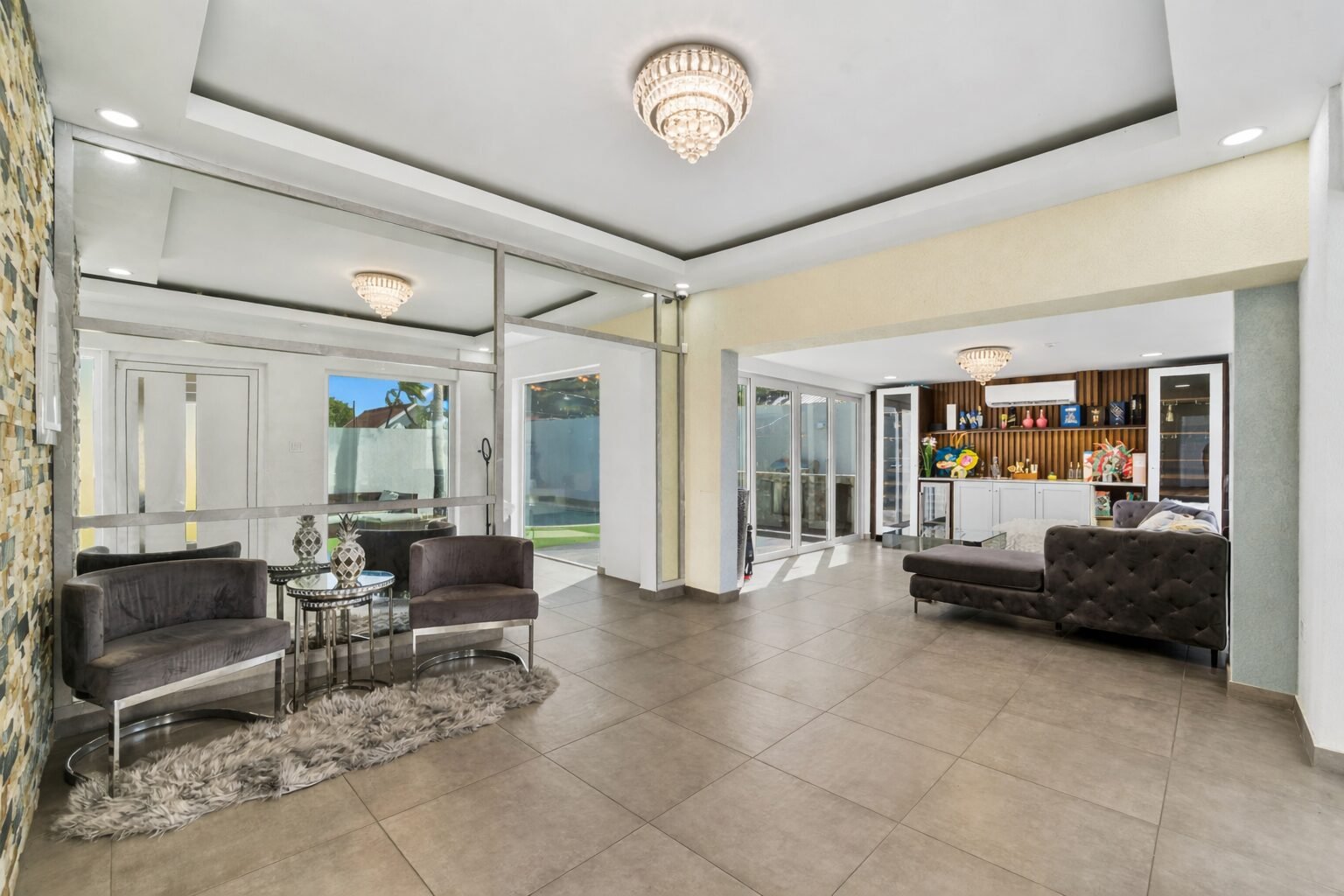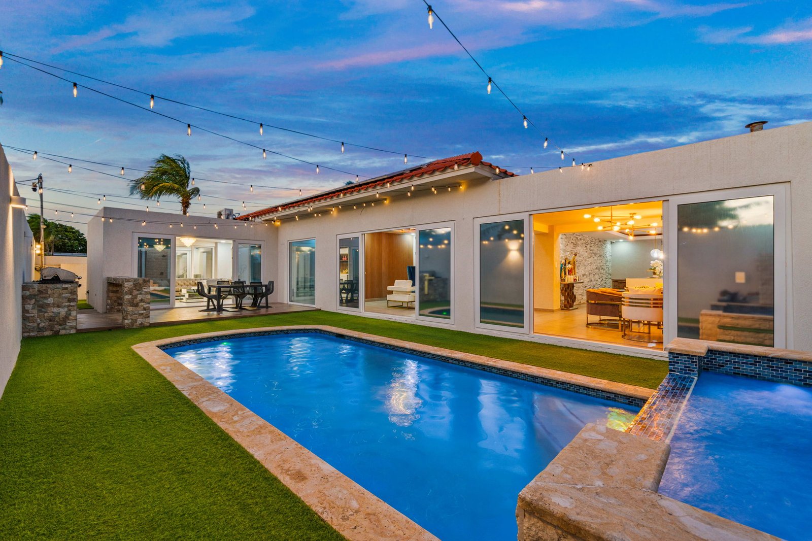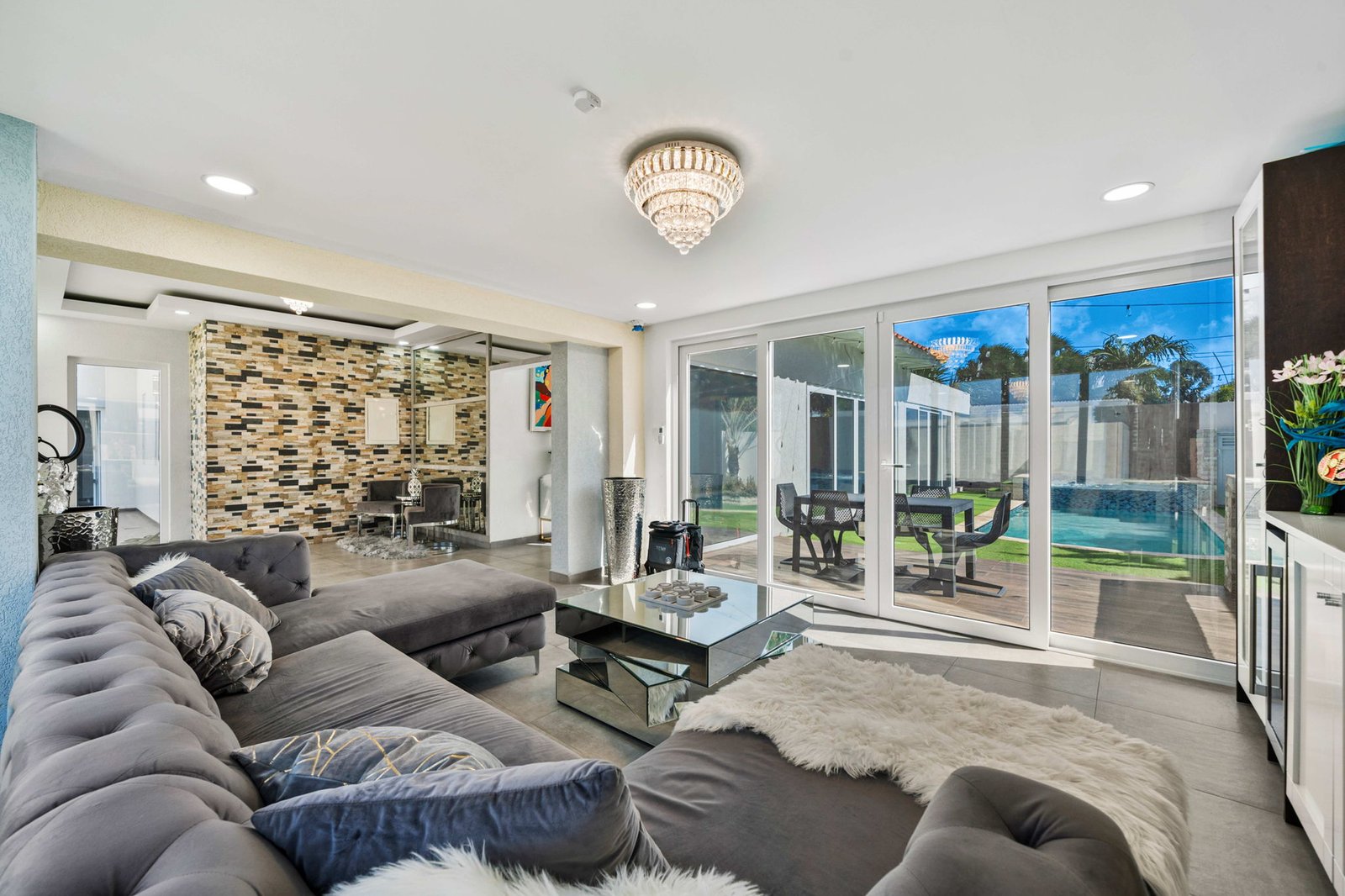 Inside, the home opens up into expansive living spaces filled with natural light. The layout has been thoughtfully designed to create a seamless flow between the living area, TV room, entertainment space, and kitchen—all connected through elegant sliding doors that lead directly to the pool area. This indoor-outdoor integration makes the home ideal for both everyday living and hosting unforgettable gatherings.