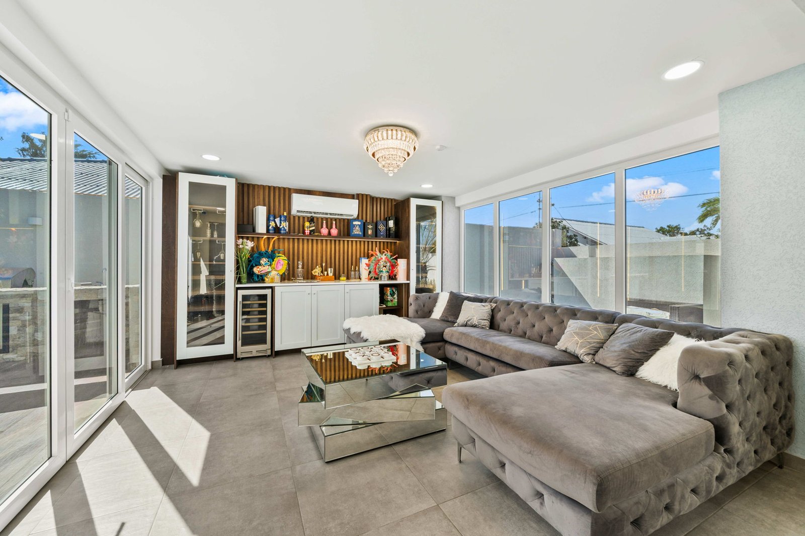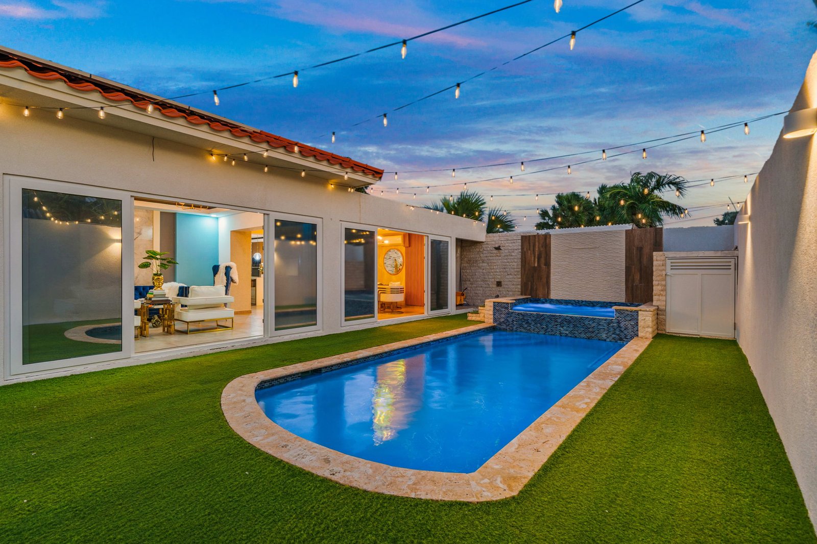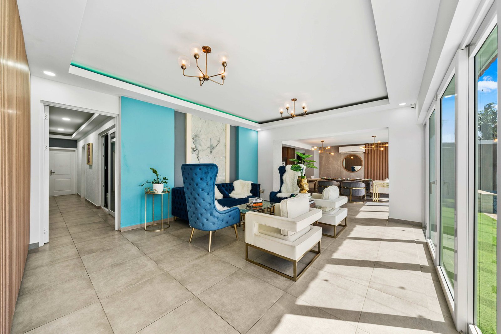Inside, the home opens up into expansive living spaces filled with natural light. The layout has been thoughtfully designed to create a seamless flow between the living area, TV room, entertainment space, and kitchen—all connected through elegant sliding doors that lead directly to the pool area. This indoor-outdoor integration makes the home ideal for both everyday living and hosting unforgettable gatherings.