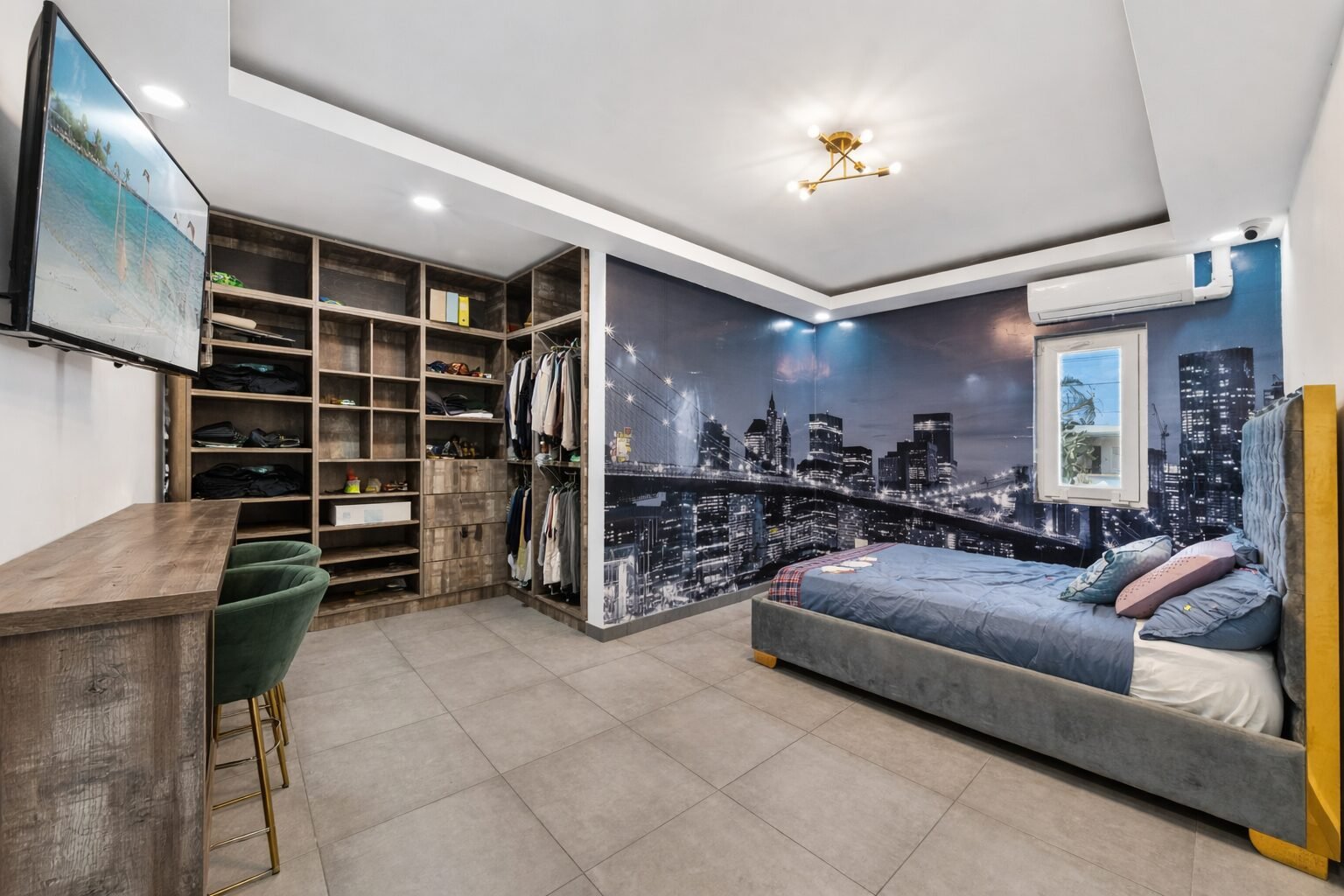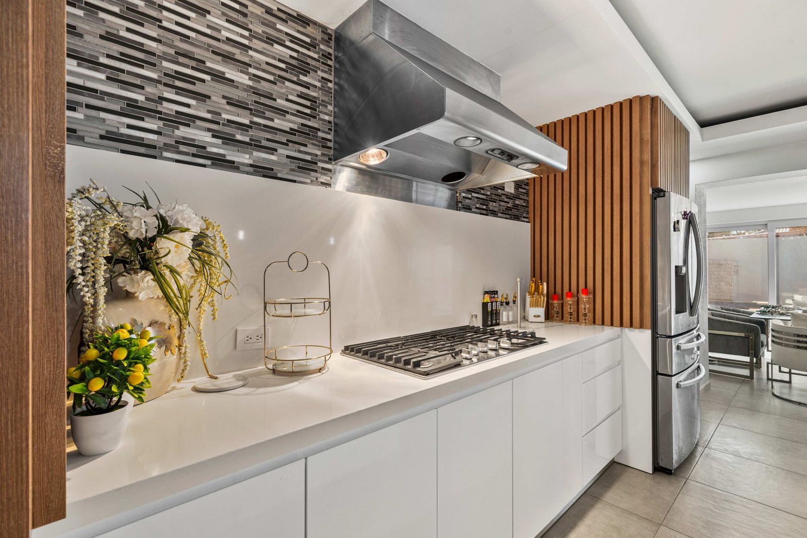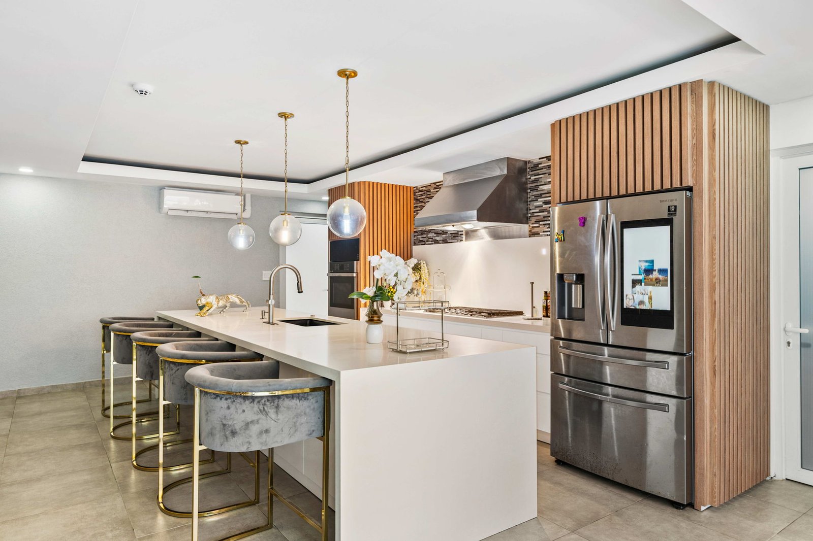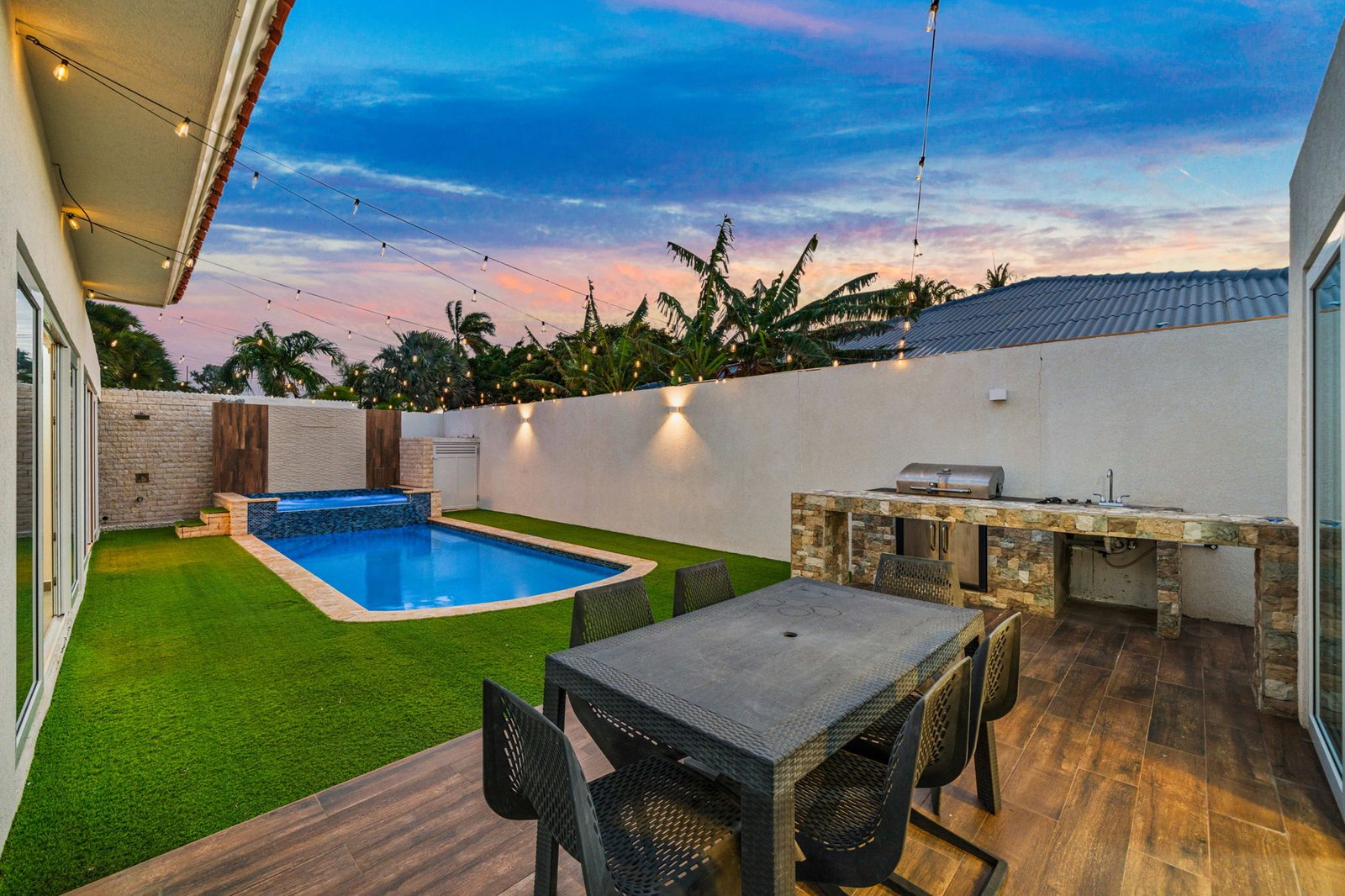 Inside, the home opens up into expansive living spaces filled with natural light. The layout has been thoughtfully designed to create a seamless flow between the living area, TV room, entertainment space, and kitchen—all connected through elegant sliding doors that lead directly to the pool area. This indoor-outdoor integration makes the home ideal for both everyday living and hosting unforgettable gatherings.